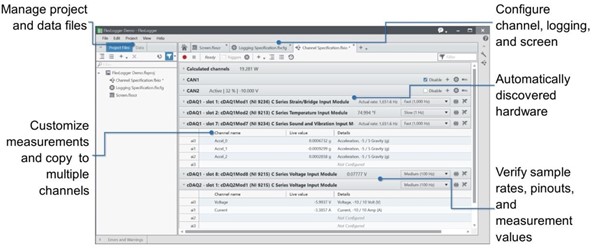 FlexLogger adalah sebuah aplikasi yang dapat digunakan untuk membangun sistem data-logging yang fleksibel dan dapat disesuaikan dengan CompactDAQ tanpa menggunakan pemograman. Menggunakan FlexLogger dengan CompactDAQ untuk memperoleh pengukuran analog seperti suhu, tekanan, tegangan, regangan, dan force dapat dilakukan dengan CAN messages. Dengan ini anda dapat menggunakan FlexLogger untuk memperoleh, melihat, dan mencatat semua data pengujian ke dalam satu file. Anda juga dapat menyesuaikan tampilan untuk melihat dan menampilkan data pengukuran yang paling penting sebelum dan selama pengujian.