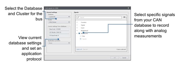 Anda juga dapat merekam data CAN bersama dengan pengukuran analog. Unggah database CAN ke FlexLogger dan konfigurasikan pengaturan komunikasi bus untuk memperoleh CAN Message. Setelah database diunggah, pilih frame atau sinyal yang anda butuhkan untuk memasukkannya ke dalam file data. Dari FlexLogger, anda juga dapat membuka Database Editor untuk membuat database baru atau memodifikasi database yang sudah ada.