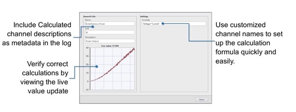 Apakah anda menganalisis data anda setelah mendapatkan data dari sebuah pengukuran? Dengan Flexlogger, anda dapat membuat channel untuk menjalankan fungsi aritmatika atau trigonometri selama pengujian, yang dicatat ke file yang sama dengan data yang belum diolah. Anda tidak perlu lagi menunggu file yang dihasilkan setelah pengukuran untuk membuat perhitungan kunci atau menerapkan skala pengukuran pada data anda.