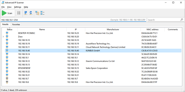 Setelah menscan IP pada aplikasi IP scanner, anda dapat menemukan RevPi dengan manufacturer KUNBUS GmbH. Setelah itu catat ip tersebut untuk kita gunakan sebagai alamat untuk melakukan remote.