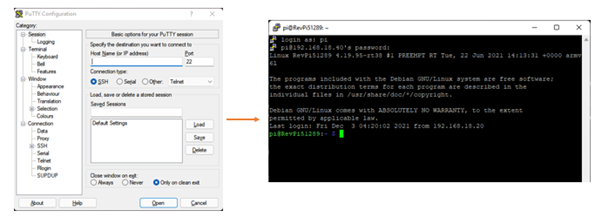 Buka aplikasi PuTTY, lalu masukan IP RevPi, ubah connection typenya menjadi SSH dan klik Connect. Setelah itu, akan ada pop-up window seperti gambar di atas. Untuk masuk ke terminal RevPi, anda harus login terlebih dahulu. Anda dapat login menggunakan default account yaitu, user : pi , dan password sesuai dengan tulisan yang ada di bagian samping RevPi anda. Setelah itu, anda dapat melakukan apa saja yang anda inginkan pada RevPi.