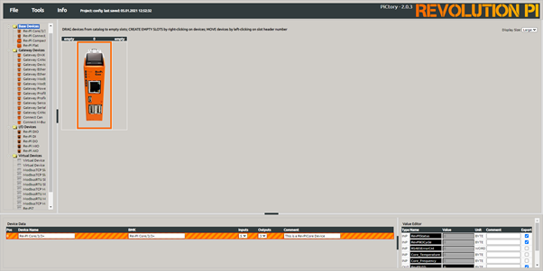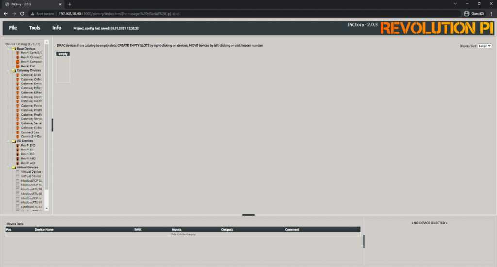 Setelah anda login, anda dapat melakukan konfigurasi RevPi anda sesuai dengan module yang digunakan. Untuk melakukan konfigurasi, caranya sangat mudah, anda dapat melihat bagian kiri tampilan yang bertuliskan“device catalog”, device yang ada pada bagian ini dapat anda drag lalu drop pada bagian tengah yang bertuliskan “empty”. Anda dapat melihat gambar di bawah ini sebagai referensi.