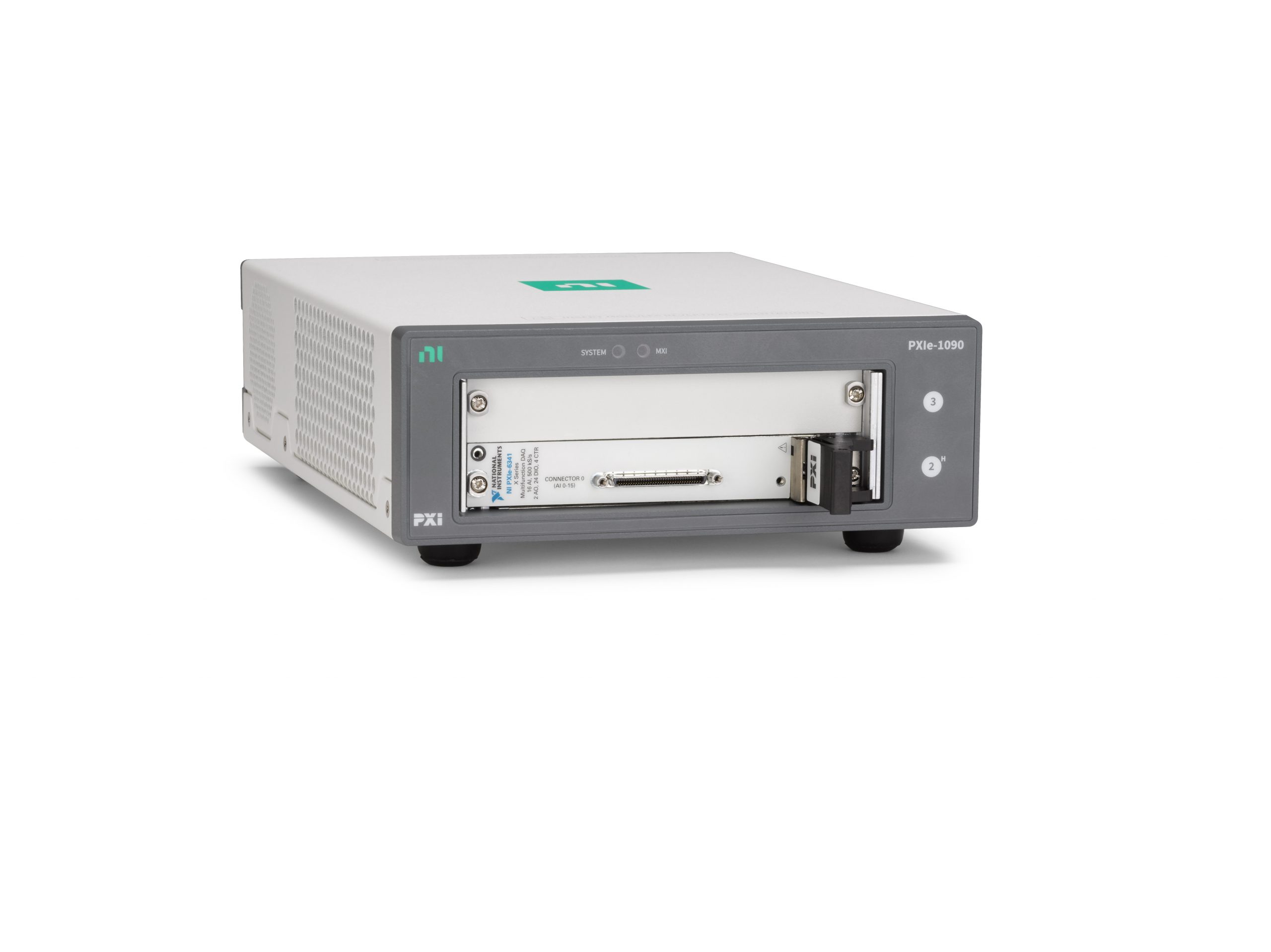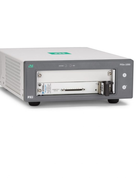 PXIe-6341 DAQ + PXIe-1090 Chassis. PXI quality instrumentation in a small, 2-slot chassis that connects to a PC/laptop with a thunderbolt cable that looks like USB-C.