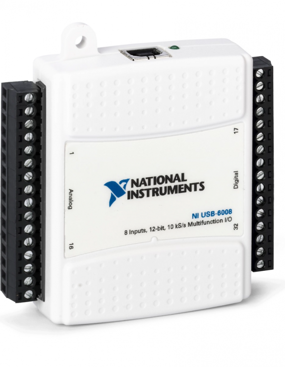 8 AI (12-Bit, 10 kS/s), 2 AO (150 Hz), 12 DIO USB Multifunction I/O Device—The USB‑6008 is a low-cost, multifunction DAQ device. It offers analog I/O, digital I/O, and a 32‑bit counter. The USB‑6008 provides basic functionality for applications such as simple data logging, portable measurements, and academic lab experiments. The device features a lightweight mechanical enclosure and is bus powered for easy portability. You can easily connect sensors and signals to the USB‑6008 with screw-terminal connectivity. The included NI‑DAQmx driver and configuration utility simplify configuration and measurements