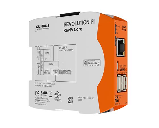 RevPi Core is the perfect device for simple tasks who don`t need quad-core performance and is equipped with the Raspberry Pi Compute Module 1. The compute module basically consists of two ICs: a Broadcom BCM2835 SoC with 512 MB RAM and a 4 GB eMMC Flash memory. A customized Raspbian incl. a RT patch is preinstalled.